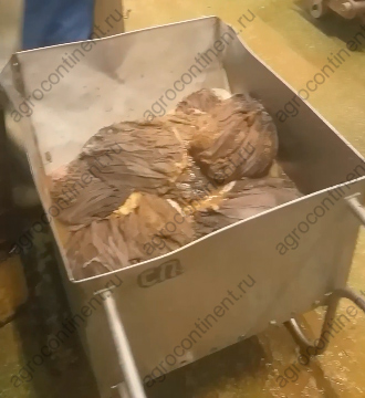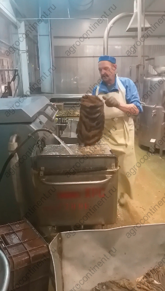 Торгово-производственная компания ООО Агроконтинент предлагает технологию и оборудование для качественной переработки всего кишпакета животных, для всех пищевых перерабатывающих производств, кто работает с: свиньи, овцы, козы, все мрс, быки, коровы, телята, все крс. На рынке очень востребован рубец крс, это желудок простыми словами и его просят и просят, как переработчики в стране, так и для экспорта, например в китай, китайцы очень охотно покупает рубец, сычуг, книжку и т.д. После разделки животного все его части расходятся по цехам, где их перерабатывают дальше, чтобы получить конечный результат готовый уже к продаже на пищевом рынке. Сотрудник, как правило это мужчина, разрезает рубец по кругу, с тем чтобы его качественно очистить от каныги и забросить в тележку с водой. Разрезанный рубец выворачивается и очищается, коныга это не переработанное желудком содержимое, или даже переработанное но частично.