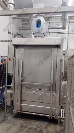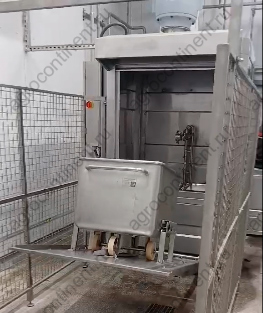 Надёжная кабинная машина мойки чанов, что используются для фарша, мяса, сыра, молока и другого продукта, изготавливается примерно за три месяца, после согласования чертежей и всех опций, что хотел бы Покупатель-Заказчик. Новая опция, это мойка колёс, когда колёса из полиуретана, как правило чёрные, но если стоят белые, то это лучше, они не оставляют следы на кафеле чистой зоны. Кабинное исполнение, позволяет полностью помыть металлическую тележку, сделанную из пищевой нержавеющей стали Aisi 304, с теми режимами температуры и времени, что требуется по использованию. Например, если мы возим мясо кусками, четвертины свиных туш, то это моется быстро, и время занимает меньше. Но если мы храним чане фарш и специи, что имеют стойкие ароматы, тогда нужно увеличивать время мойки и возможно даже, поднимать температуру до 80-ти градусов Цельсия. Стандартная температура мойки, это около 60-ти градусов, и применение моющего средства, щелочного, что тоже зависит от качества воды. Мы ставим специальные датчики электропроводности, и они помогают с регулировкой концентрации моющего и дезинфицирующего средства. У нас всегда, все комплектующие и запасные части есть в наличии на складе.