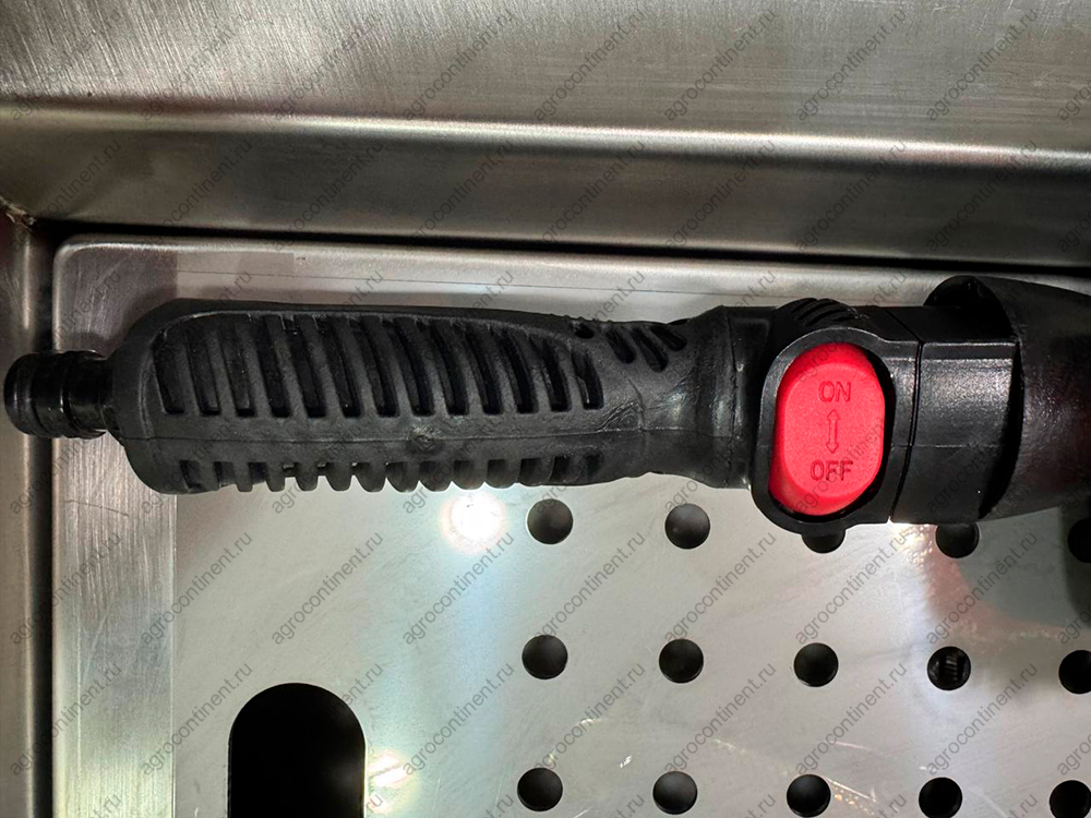 Качественная ручная мойка обуви работает благодаря качественной щётке с клапаном, это когда включение и выключение подачи воды осуществляется прямо на ручке. Щётка с подачей воды, это когда через щетинки подаётся необходимая для помывки жидкость, это может быть как вода, так и жидкость для дезинфекции и обеззараживания. Отверстия для подачи воды под щетиной, их не видно сразу, но при увеличении давления напора воды, подача увеличивается и быстро можем помыть подошву, голенища или весь ботинок сразу. Если мыть резиновые сапоги, тоже очень удобно, так как щётка имеет длинный ворс, ней легко сверху вниз сметать пыль и обработать всю поверхность. Сама конструкция выполнена из пищевой нержавеющей стали Aisi 304, что обеспечивает долгий срок службы и сохранение хорошего товарного вида. Нержавейка у нас не китайская, а их Европы, точнее из Германии и Италии приходят листы стали. Нержа самого высокого качества и ржаветь она не будет, и магнититься она тоже не должна, хотя лёгкие моменты существую, всё зависит от партии поставки.