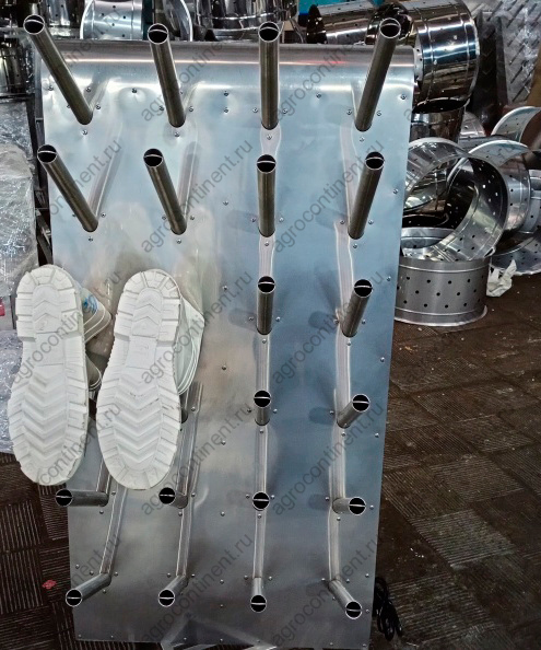 Производственный процесс требует чистой сменной одежды и разнообразных защитных приспособлений. Для обуви, рукавиц и аксессуаров настенная установка с рожками подходит наилучшим образом. В отличие от напольного модуля она не занимает место. Секция санитарного контроля получается на 30% меньше по площади. Термостат ограничивает температуру воздуха на выходе до 70 градусов, такую же температуру имеет и внешний корпус. Для монтажа необходимо покрытие на стене из несгораемого материала.