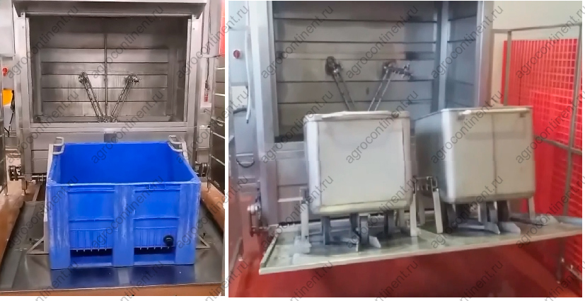 Торгово-производственная компания ООО Агроконтинент, предлагает заказать в производство и купить универсальную машину для мойки пищевой производственной тары, такой как: пластиковые биг-боксы евро и чан-тележки пищевые с объёмом 100 и 200 литров. Если чан-тележка не стандартная, например на 300 литров, тогда нужно делать машину мойки с вилами, чтобы габаритный размер входа, соответствовал нашему чану. Универсальная мойка чанов и боксов имеет универсальное крепление для помывки тары внутри моечной кабины. При закрывании двери, что происходит при помощи гидравлического привода, тара устойчиво стоит на поверхности крыши-двери. Можно сделать помывку колёс чебурашки и опор бокса, но это дополнительная опция, и она кому-то нужна, а кому-то нет. В целом удорожание будет при мойке колёс чан-тележки и опор биг-бокса, но оно не значительное, сделаем при необходимости.